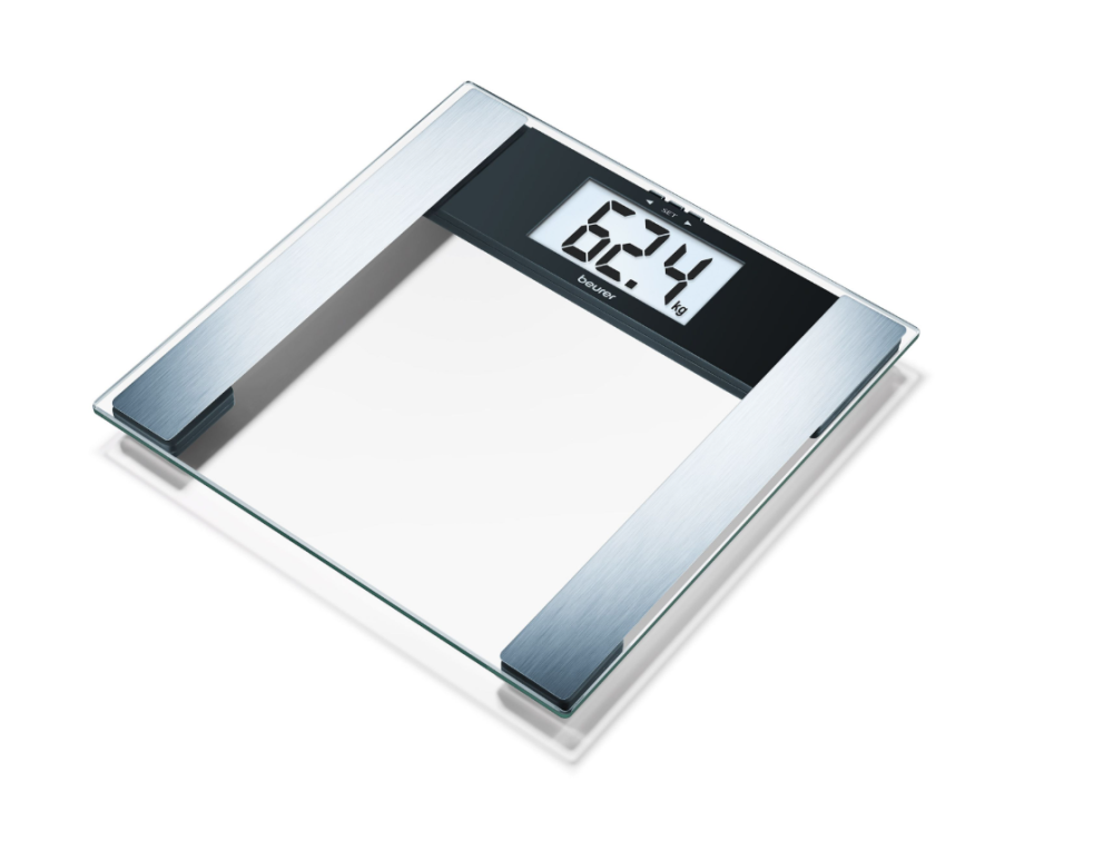 تعرّف على وزن الجسم والنسبة المئوية للدهون والماء والعضل في الجسم باستخدام ميزان الجسم التشخيصي بويرر BG 17. يحتوي الميزان على منصة زجاجية وشاشة إل سي دي كبيرة جدًا وسهلة القراءة.