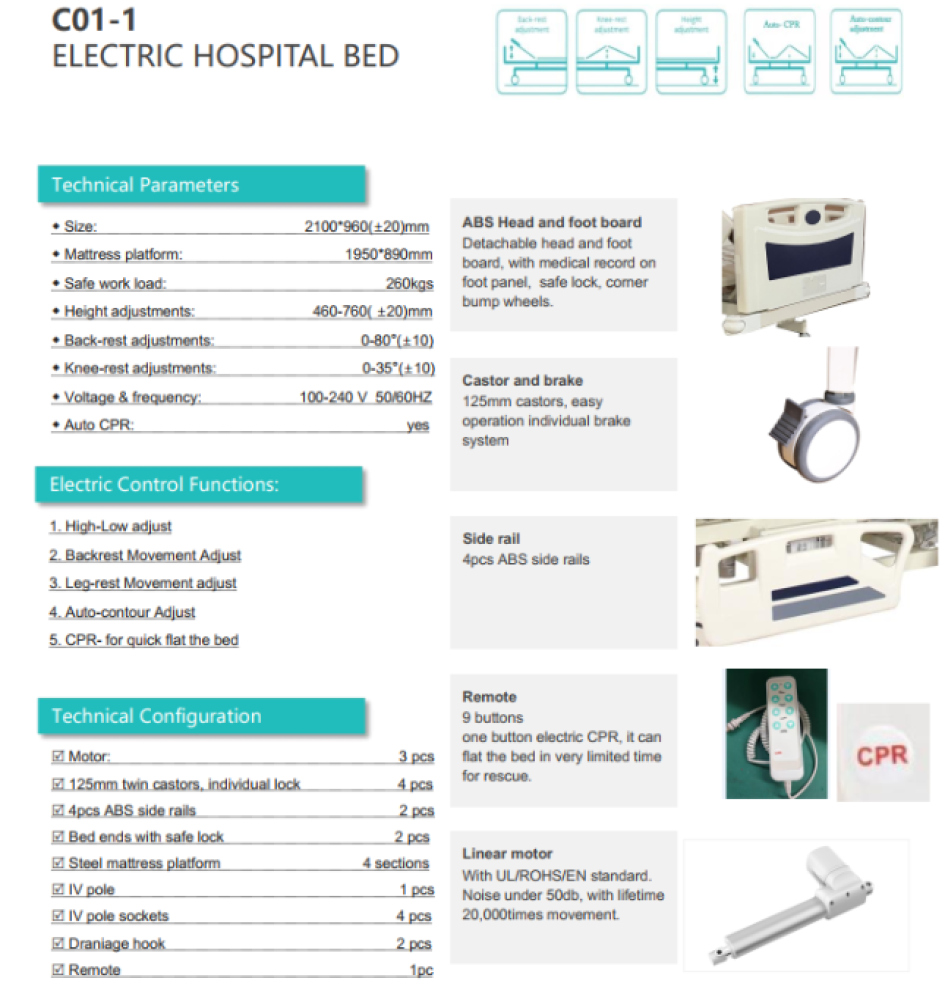 - مواصفات سرير كهربائي 4حركات + حركة CPR جوانب هيدروليك: