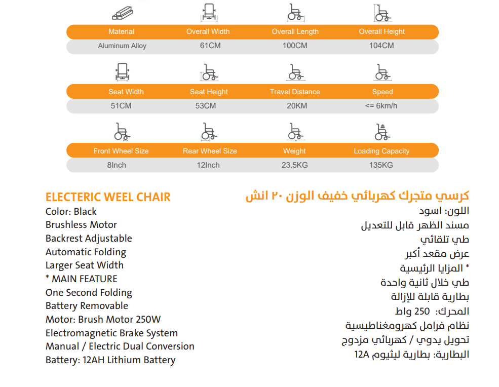 مصنوع من خامات عالية الجودة توفر المتانة والثبات، مزود ببطارية طويلة العمر وشاشة تحكم سهلة الاستخدام. مناسب للاستخدام اليومي داخل وخارج المنزل، ويُعد مثاليًا لكبار السن، وذوي الإعاقة الحركية، أو من يحتاجون دعماً إضافياً في التنقل المستقل.