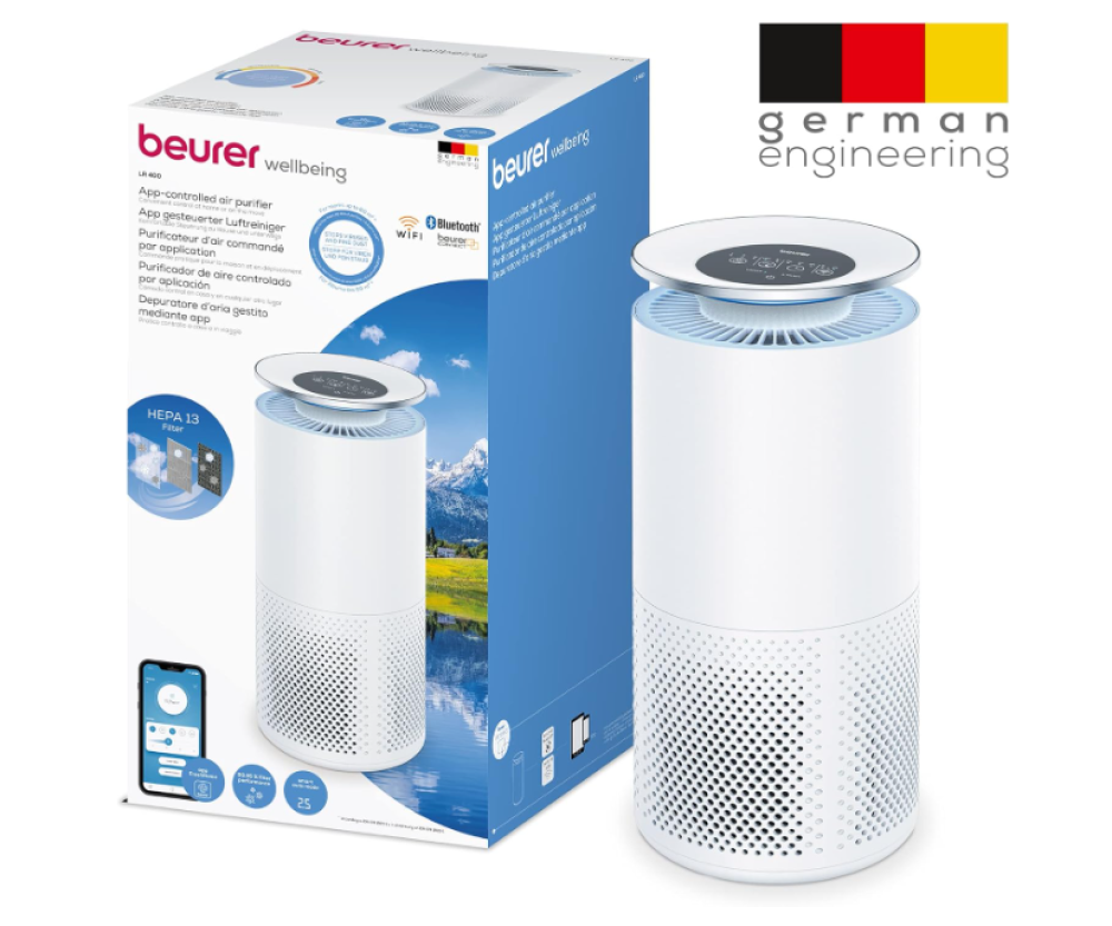 يعتمد منقّي الهواء Beurer LR 400 نظام فلترة ثلاثي الطبقات: فلتر أولي لإزالة الغبار والشعر والحشرات الصغيرة، فلتر HEPA H13 يلتقط 99.95% من الجسيمات ≥0.3 µm (وحتى الفيروسات حتى 0.02 µm)، وفلتر الفحم النشط لامتصاص الغازات والروائح. يغطي مساحات تصل إلى 69 م²، ويمكن مراقبته والتحكم به عبر تطبيق “beurer FreshHome” بالبلوتوث والواي فاي. يتضمن 4 سرعات، وضع ليل هادئ (30 ديسيبل)، وضع توربو، مؤقت حتى 24 ساعة، ومؤشر جودة الهواء LED. مؤشر تغيير الفلتر ينبهك بعد حوالي 4,320 ساعة تشغيل
